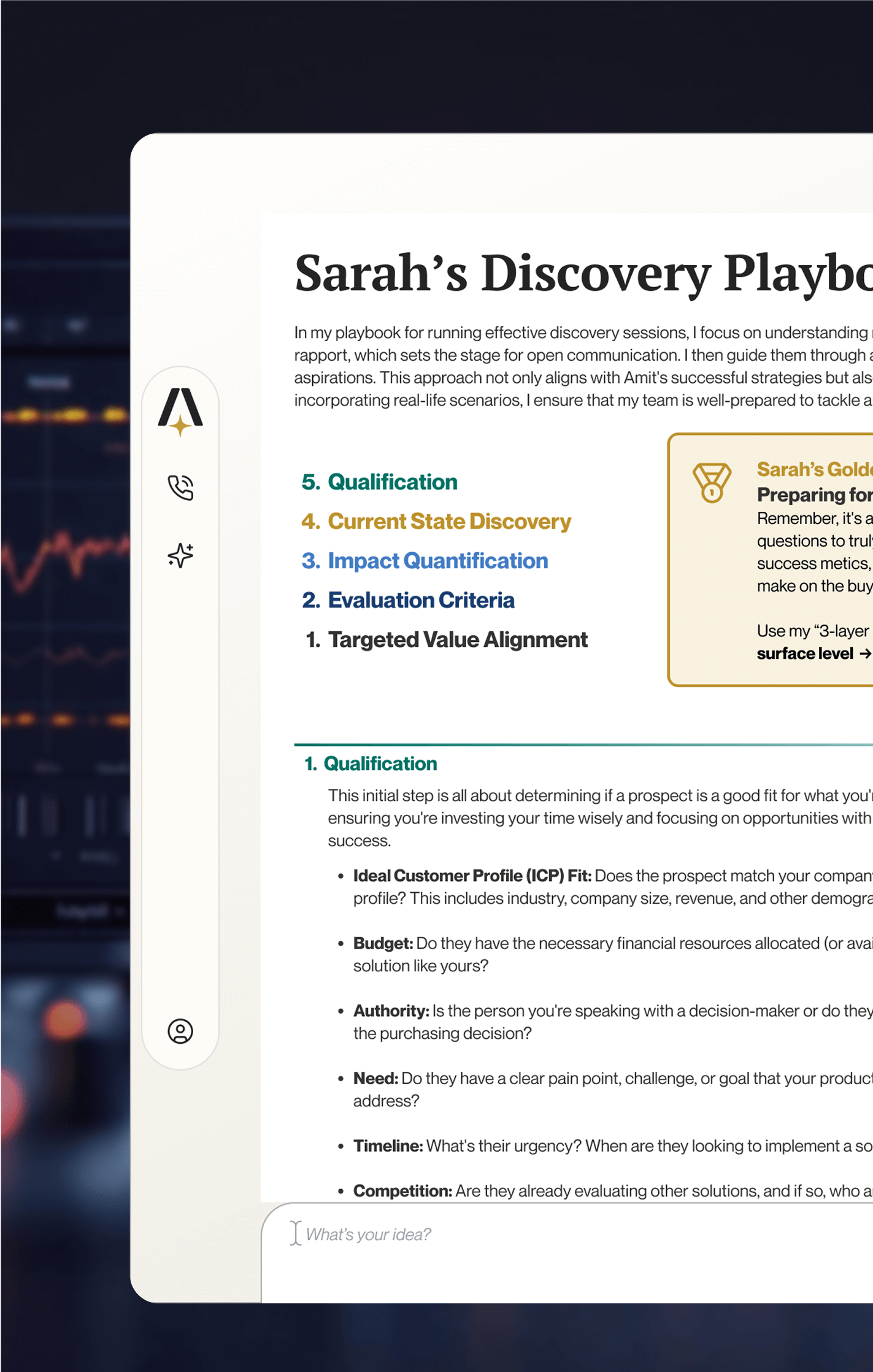 Prepares you to win every critical conversation. Builds meeting briefs, coaches on objection handling, practices tough scenarios.